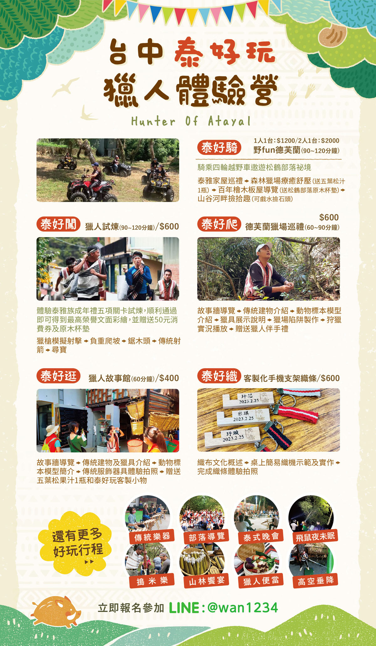 泰好玩獵人體驗營 全台灣最深入泰雅文化活動體驗 立即體驗 快追蹤我們吧 Facebook-f Instagram Line 走進部落| 感受泰雅無論是想要挑戰體能,還是靜心體驗織布歌聲,或是在夜裡聽飛鼠掠過的聲音,這裡都有適合你的行程。探索,從泰好玩開始。 泰好騎-野fun德芙蘭活動介紹 泰好闖-獵人試煉活動介紹 泰好爬-德芙蘭獵場巡禮活動介紹 泰好逛-獵人故事館活動介紹 泰好織-客製化手機織條活動介紹 台中泰好玩 · 獵人體驗營泰雅部落深度旅遊「泰好玩獵人體驗營」帶你走進台中和平區泰雅部落,挑戰充滿智慧與勇氣的獵人試煉。從 獵槍模擬射擊、負重爬坡、鋸木頭、傳統射箭、尋寶口簧琴 到德芙蘭獵場巡禮、獵人故事館、織布體驗、四輪越野車冒險,結合泰雅文化與戶外冒險,適合親子、團體、公司行程。體驗過程不僅能感受原住民的生活智慧,還能獲得紀念小禮物、原木杯墊、部落特色飲品,留下難忘回憶。 還有更多好玩行程 傳統樂器、部落導覽、泰式晚會、山林饗宴、搗米樂、飛鼠夜未眠、獵人便當、泰好織手作、 瞭解更多
